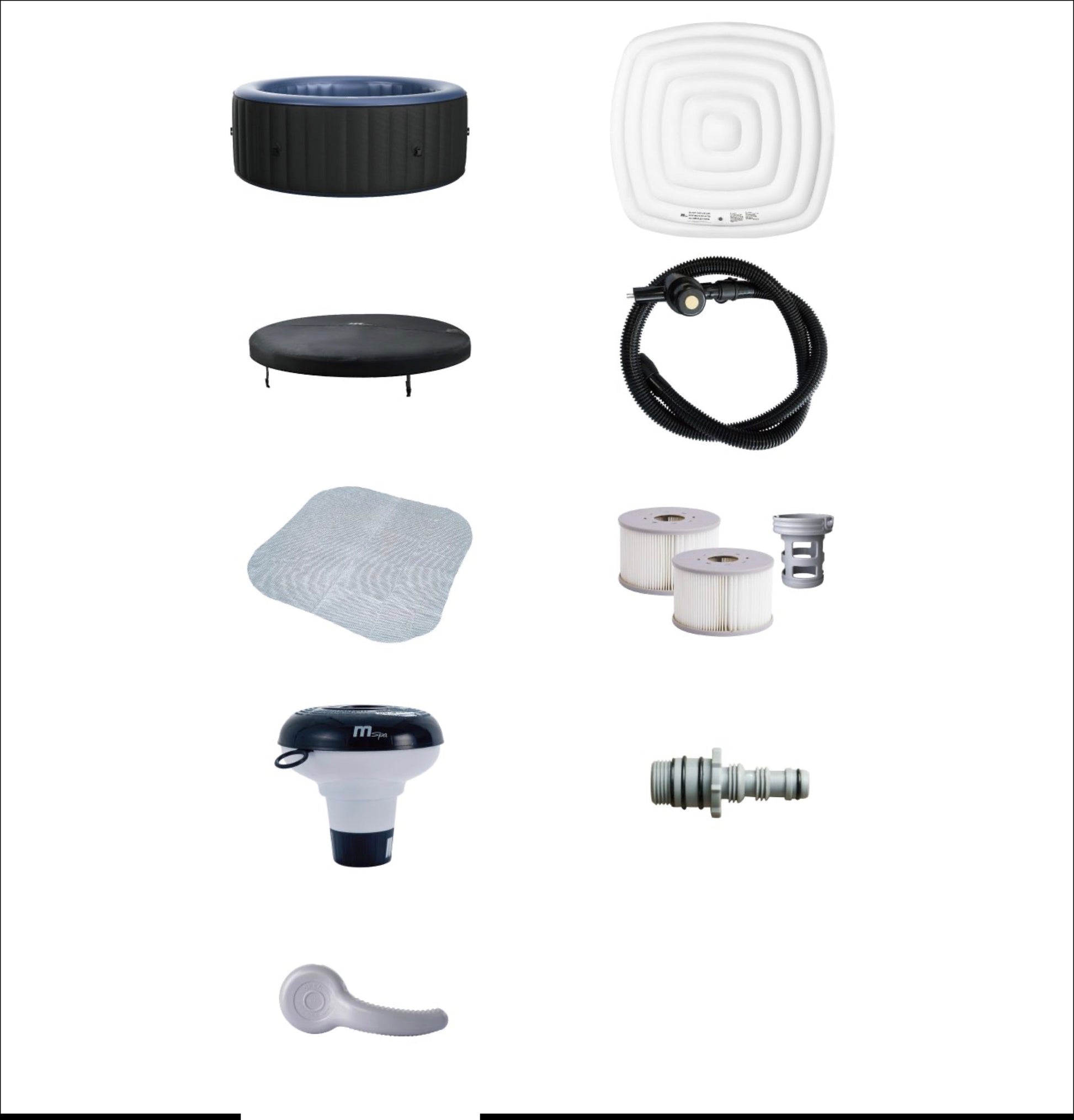 Bergen Spa, Buckle Spa Cover, Garden Hose Adapter, Inflation Hose, Chemical Dispenser, Filter Cartridge x2, Cartridge Base, Wrench