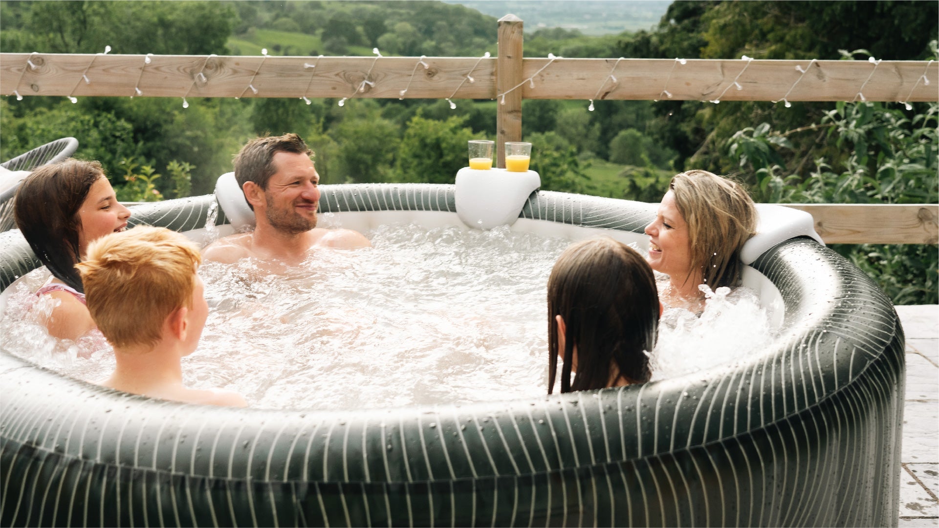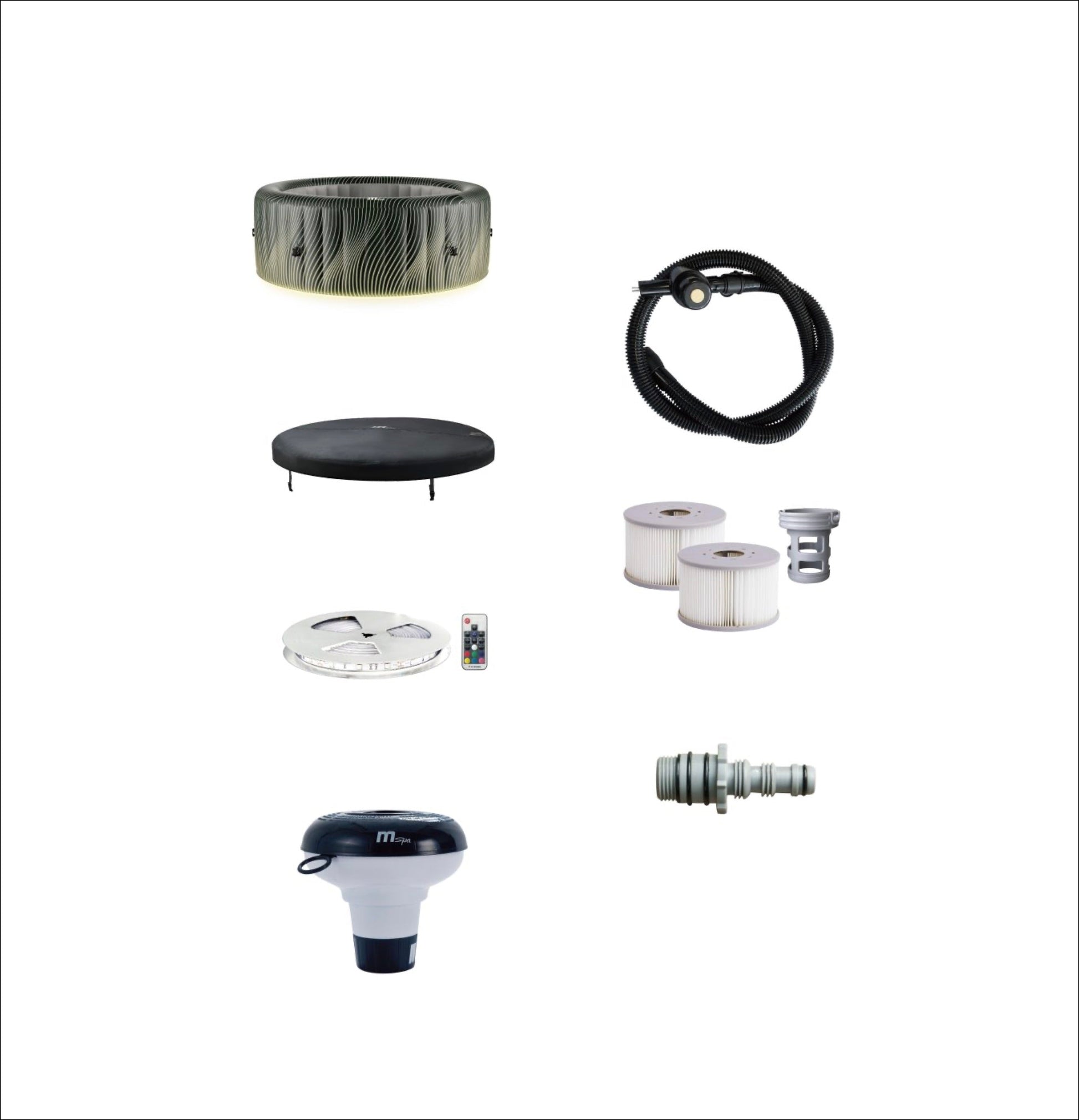 Meteor Spa, Spa Cover, LED Strip, Garden Hose Adapter, Inflation Hose, Filter Cartridge x 2, Cartridge Base, Wrench, Chemical Dispenser