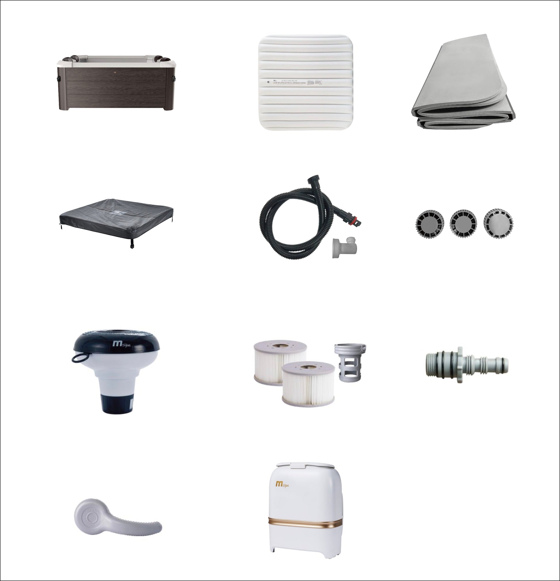 Tribeca Spa, All-in-one Control Box, Inflatable Bladder, Buckle Spa Cover, Foldable Ground Mat, Chemical Dispenser, Filter Cartridge x 2, Filter Cartridge Base, Garden Hose Adapter, Inflation Hose and Adaptor, Air / Water Stopper Caps, Wrench, Owner’s Manual