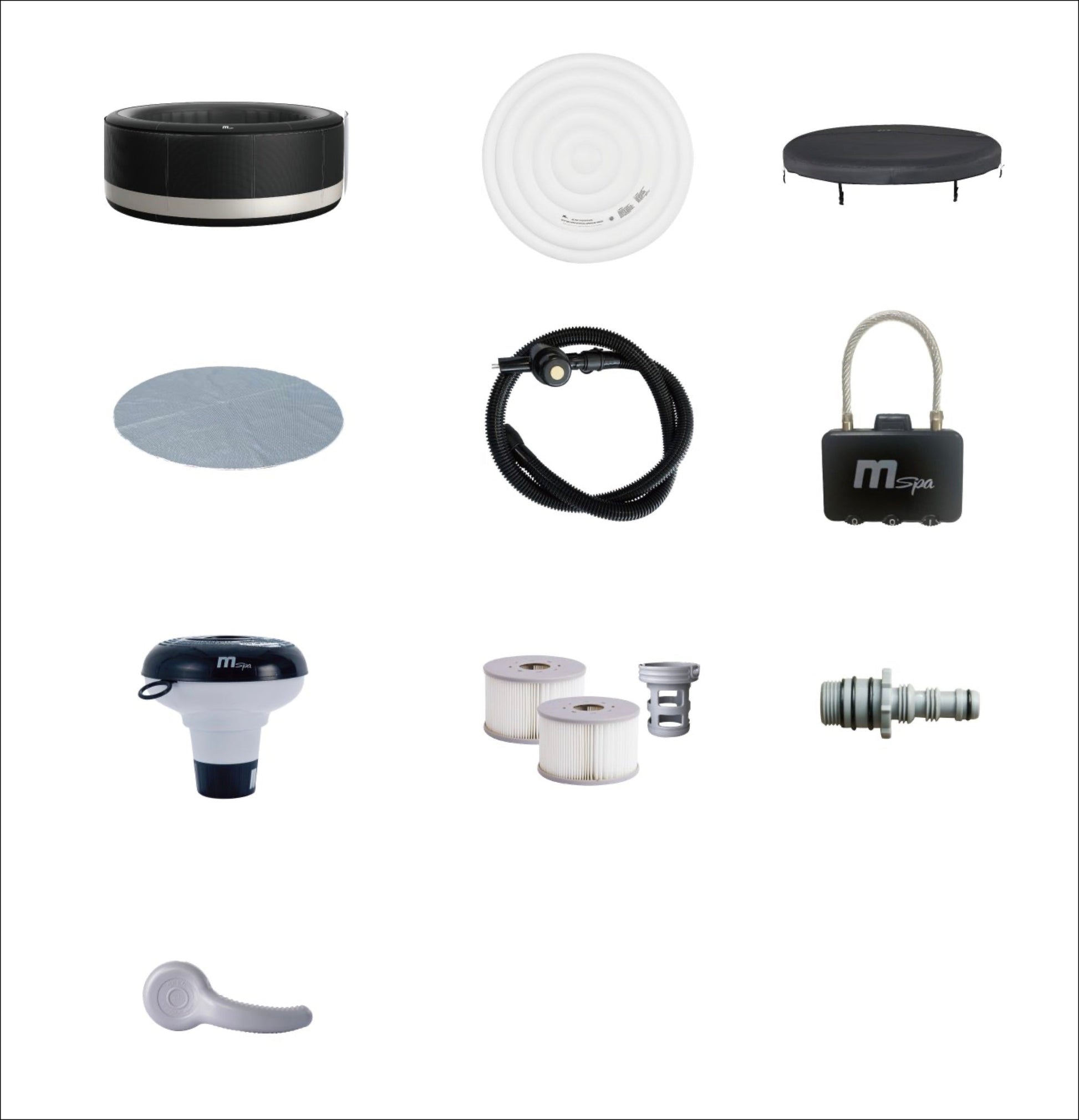 Camaro Spa, Inflatable Bladder, Spa Cover, Heat Preservation Mat, Digital Lock, Garden Hose Adapter, Inflation Hose, Filter Cartridge x 2, Filter Cartridge Base, Chemical Dispenser, Wrench