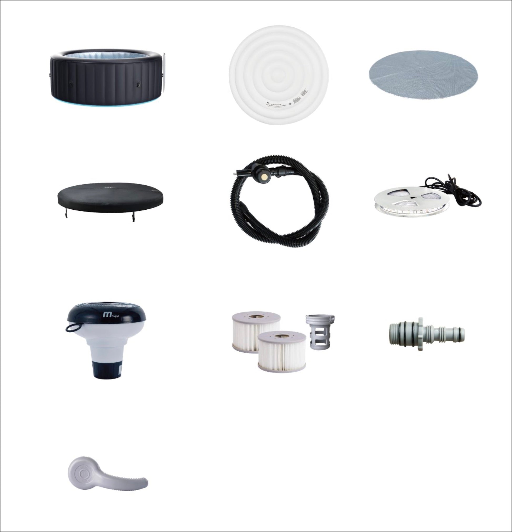 Aurora Spa, Spa Cover, Inflatable Bladder, Heat Preservation Mat, LED Light Strip, Garden Hose Adapter, Inflation Hose, Filter Cartridge x 2, Filter Cartridge Base, Wrench, Chemical Dispenser